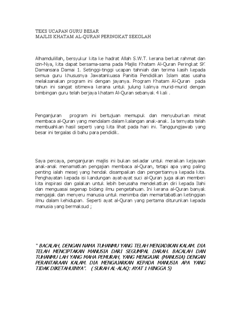 Teks Ucapan Khatam Quran Guru Besar Pdf